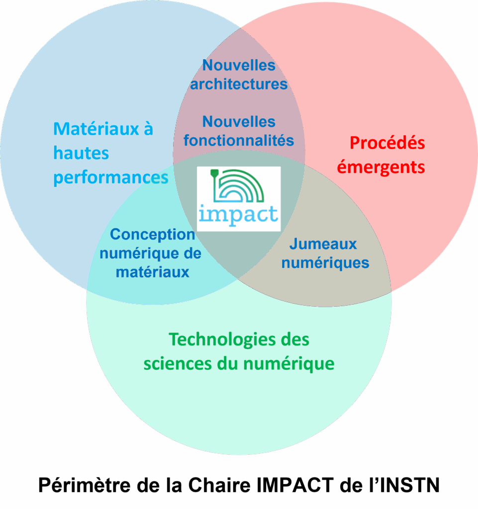délimitant ainsi le périmètre des actions de formation et de recherche de la chaire IMPACT de l’INSTN qui cherche à développer les interactions entre ces trois composantes. Ces activités regroupent notamment le développement de jumeaux numériques de procédés, la recherche de nouveaux matériaux fonctionnels et la conception numérique de matériaux.