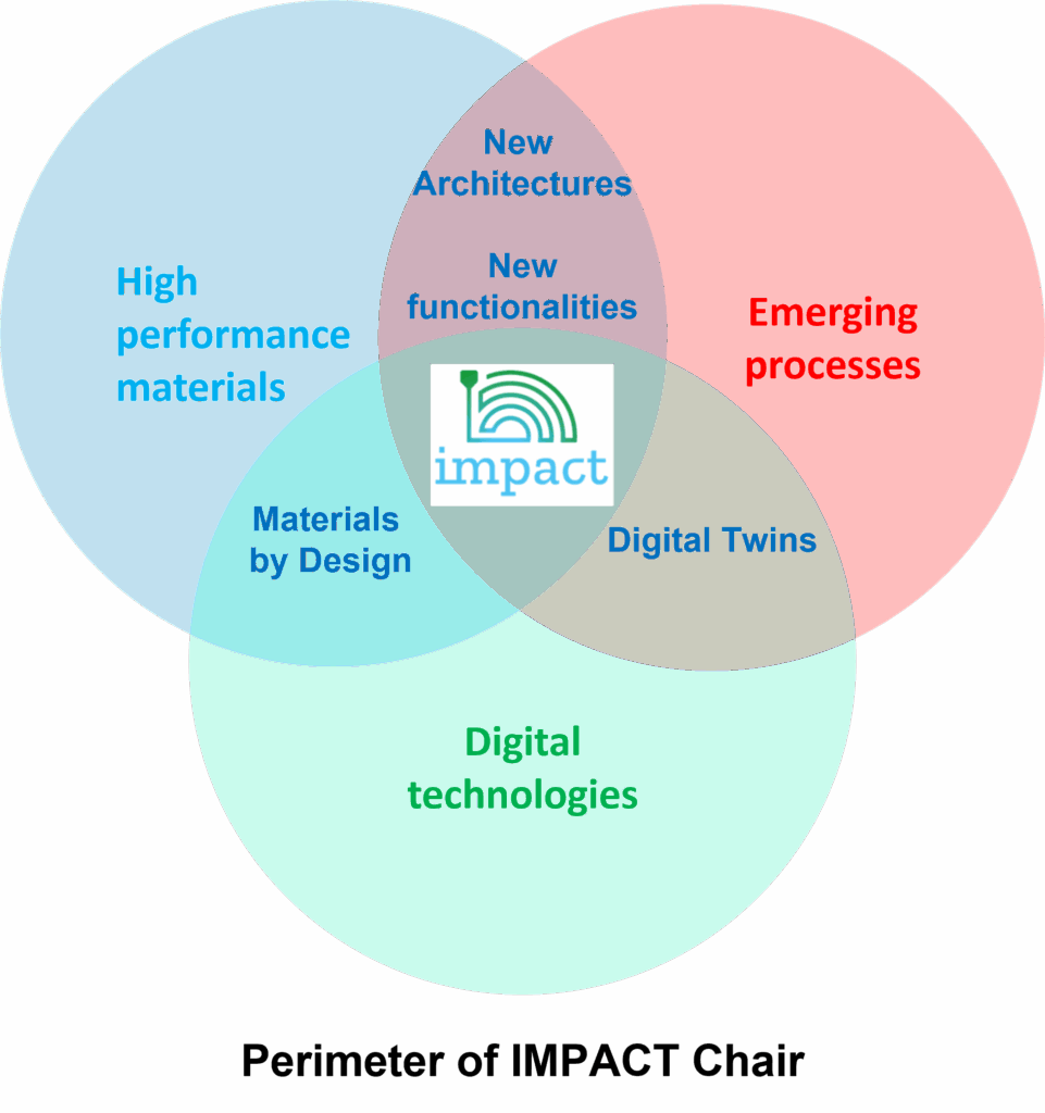 define the perimeter of training-research activities of the IMPACT chair which is looking forward to develop interactions between theses three components. In particular, theses activities aggregate the development of processes digital twins, research of new functional materials and Materials-by-design