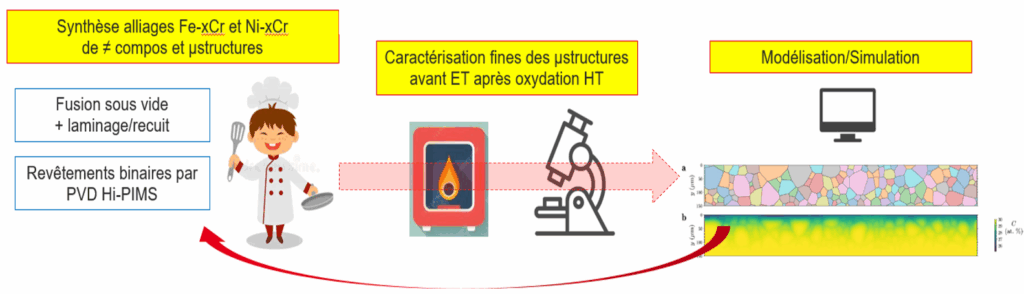 Des alliages et revêtements de différentes compositions et microstructures seront synthétisés par métallurgie classique et PVD-HiPIMS (DIADEM-2D). Le comportement en oxydation des échantillons sera étudié à différentes températures (300-900 °C) et les couches d’oxydes analysées par diverses techniques d’analyse (microscopie électronique à balayage, microscopie électronique en transmission, diffraction des rayons X, etc.). Les résultats expérimentaux seront comparés à des simulations obtenues via le logiciel COMSOL et des codes développés en interne.