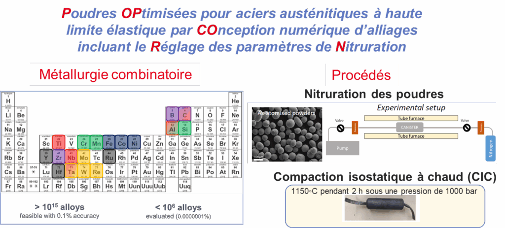 Le projet POPCORN vise à concevoir, en respectant des contraintes d’éco-design, des nouvelles chimies d’aciers inoxydables austénitiques établies « sur mesure » pour les conditions spécifiques vécues par la pièce en service et adaptées à son mode d’élaboration : ici la métallurgie des poudres pour des pièces nécessitant une haute limite élastique, obtenues par nitruration contrôlée, puis densifiées par CIC. Le projet propose une démonstration complète de la méthodologie : du design numérique sur une large gamme de compositions possibles, basée notamment sur des calculs massifs CALPHAD pour certains des critères de design, jusqu’aux tests mécaniques de quelques nuances ainsi optimisées, élaborées et mises en forme.